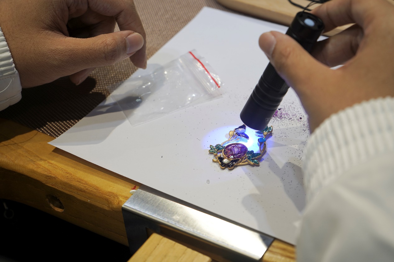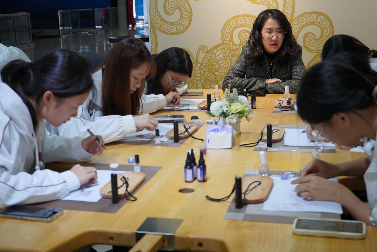 参观交流后,周大福珠宝文化中心的相关负责人,向师生们讲授了作为传统工艺之一的螺钿工艺的理论知识。并带领学生进行螺钿工艺的DIY制作,即讲即练,推动理论与实践的进一步结合。在首饰制作过程中,学生们不仅被螺钿工艺的魅力深深吸引,更在动手实践中激发了无限的创意,为珠宝设计与时尚传播专业的未来发展培养了更多具备扎实实践技能与创新能力的应用型人才。此次活动不仅是一次对传统工艺的传承与弘扬,更为珠宝设计与时尚传播领域注入了新的活力与灵感,为培养新一代时尚珠宝设计师奠定了坚实的基础。