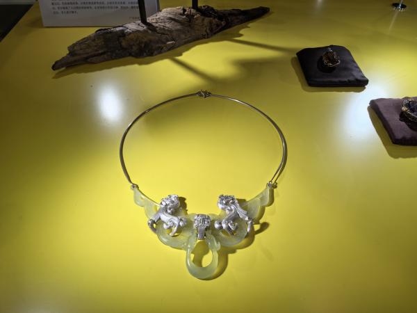 工艺新秀曹旭峰老师作品《蟠魑》 以岫岩玉和925银为材质,作品左右两只蟠螭相对称,尾巴钩嵌在玉器上,生动别致。同时加入了岫玉制的璎珞元素,更添吉祥富贵之意,象征了中华古代的文化内核。