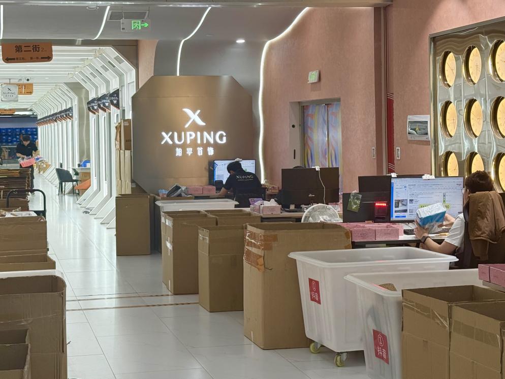师生们在企业负责人的带领下,先后参观了旭平首饰商场展厅内的商品展示区、零售区、打包区、退货区、分拣区及全平台运营直播间,全方位观摩了从产品陈列、线下零售、订单处理到多平台直播带货的商业运作闭环。在商品展示区,琳琅满目的首饰产品涵盖国风、轻奢、通勤等多元风格,从设计理念、材质工艺到搭配场景的完整呈现,让师生直观感受企业的设计实力与品牌审美;零售区的沉浸式消费场景搭建,展现了企业对线下体验与用户服务的重视;打包区、退货区、分拣区的标准化作业流程,高效有序的货品管理体系,让大家深刻认识到供应链后端运营对电商业务的核心支撑作用。