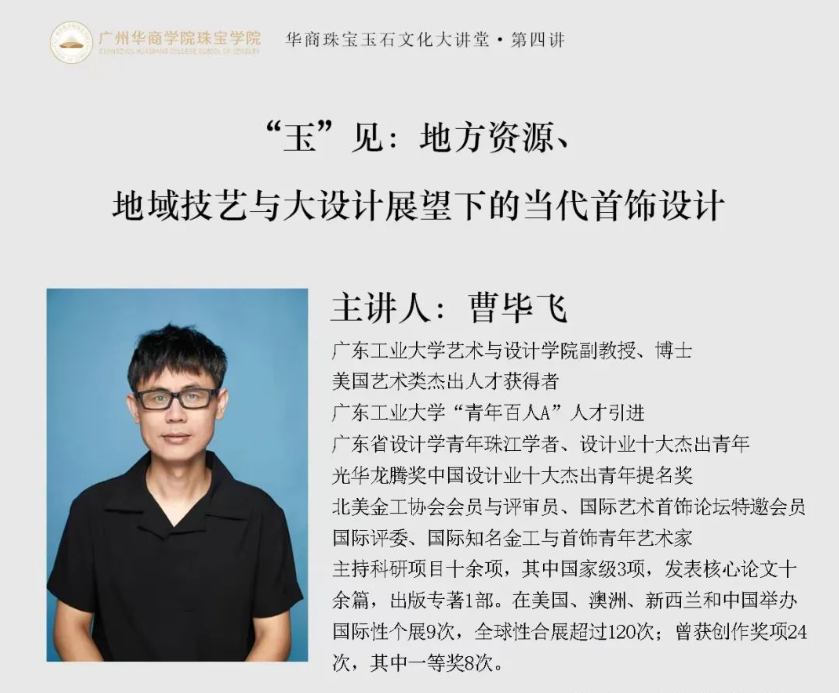 11月09日,华商学院太阳集团tyc138 “华商珠宝玉石文化大讲堂” 第四讲,邀请了曹毕飞副教授前来授讲,此次以“玉”为主题的「“玉”见:地方资源、地域技艺与大设计展望下的当代首饰设计」的讲座,吸引了众多同学前来听取。同学们也为曹老师的到来,献出了最热烈的掌声。