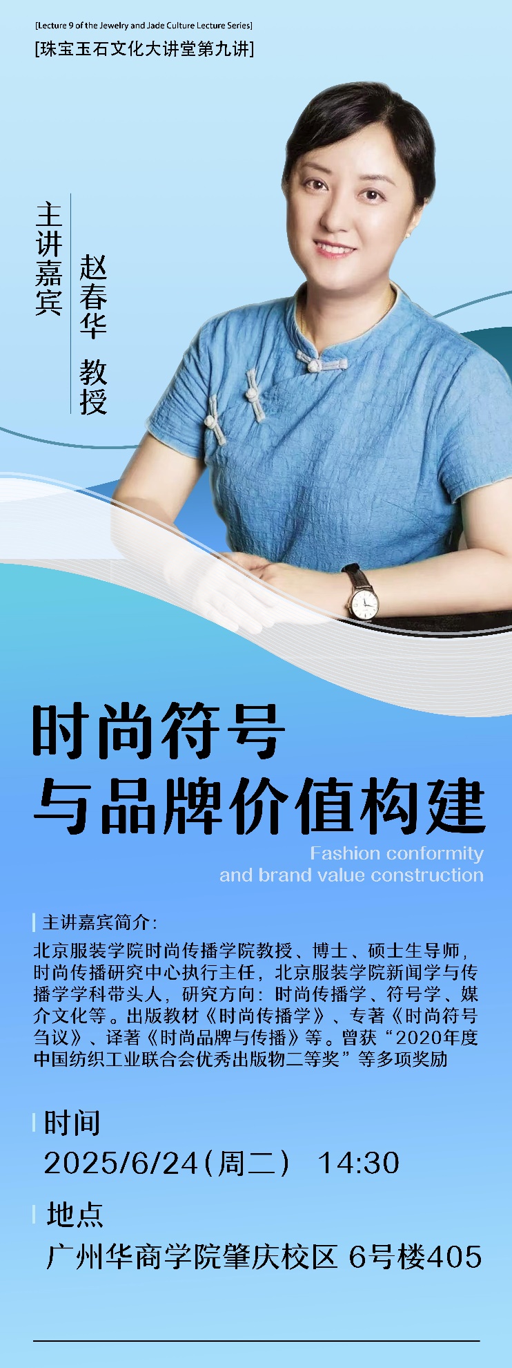 珠宝玉石文化大讲堂第九讲即将开讲!作为第二届华商珠宝文化节的重要内容,本次学术讲座,我们有幸邀请到北京服装学院时尚传播学院赵春华教授,她将给广大师生带来专题讲座《时尚符号与品牌价值构建》,带你解码时尚符号密码,洞悉品牌价值构建逻辑,热爱时尚、关注品牌文化传播的学子,不可错过!
