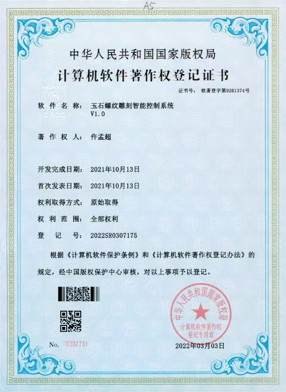 图4 仵孟超大师的玉石螺纹雕刻智能控制系统登记证书
