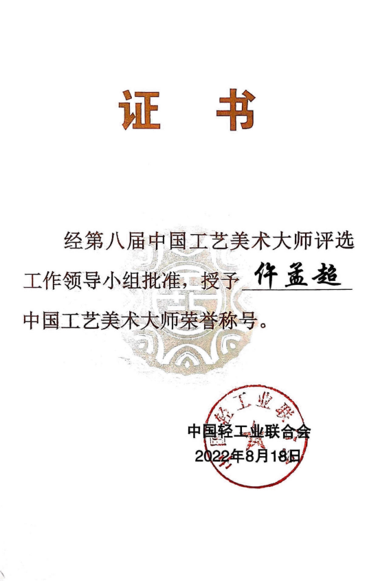 图2 仵孟超大师被授予中国工艺美术大师荣誉称号